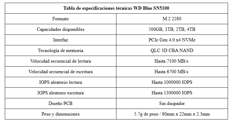 Especificaciones clave, WD Blue SN5100, prácticamente para cualquier usuario